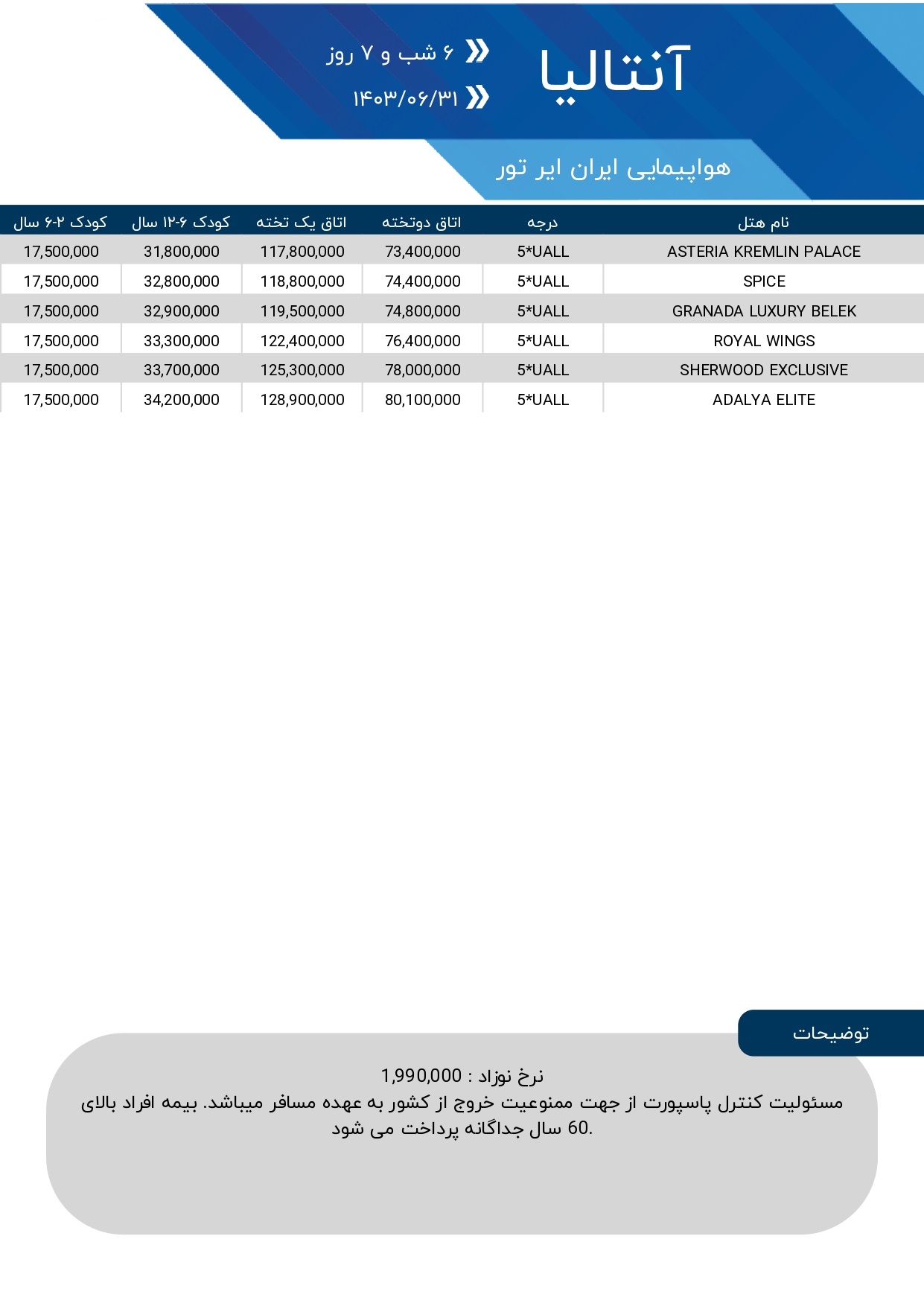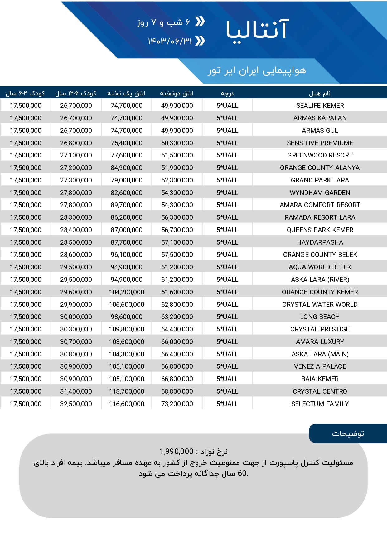 هر نفر در اتاق دوتخته | هر نفر در اتاق یک تخته | هر نفر در اتاق سه تخته | 6 تا 12 سال با تخت | 2 تا 6 سال بدون تخت | موقعیت | توضیحات |