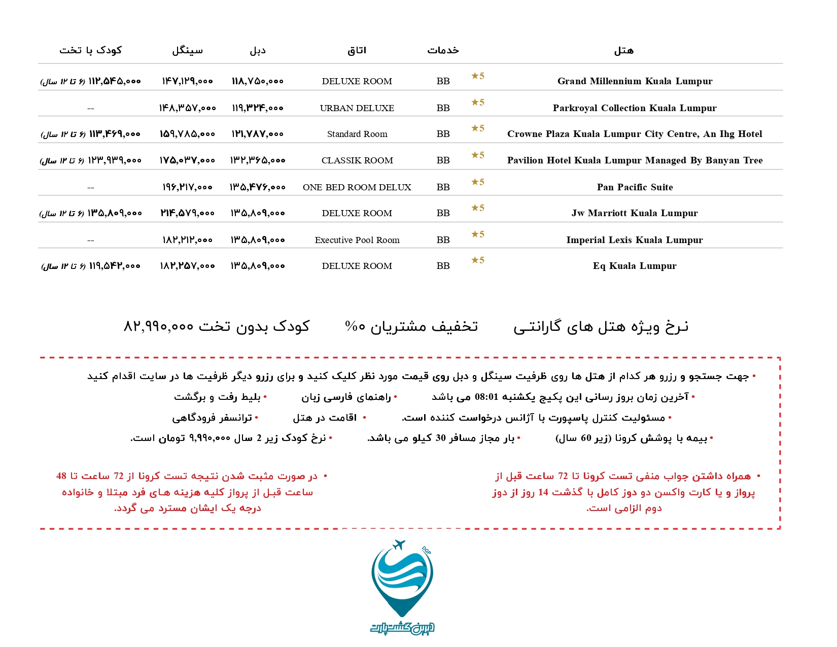 نرخ کودک زیر 2 سال ۹,۹۹۰,۰۰۰ تومان است.
